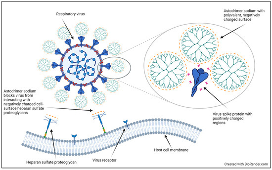 Astodrimer sodium is a large, negatively charged polylysine dendrimer with antiviral activity against a broad spectrum of viruses, including SARS-CoV-2 variants of concern, as demonstrated in vitro [14,15] and in vivo [16]. Astodrimer sodium has a polyvalent structure that enables multiple engagement of the positively charged regions of viral surface or spike proteins that interact with negatively charged host–cell surface heparan sulphate proteoglycans (HSPGs) to initiate the infection process. The polyvalent electrostatic interaction of astodrimer sodium with the virus attachment proteins is effectively irreversible, leading to inactivation of the virus and elimination of its ability to interact with the host–cell surface HSPGs (Figure 1).