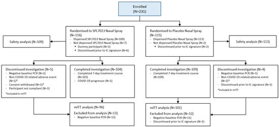 A total of 231 participants were enrolled in the study between 9 January and 20 September 2023 (astodrimer sodium nasal spray n = 116, placebo n = 115). The safety population comprised 222 participants (astodrimer n = 109, placebo n = 113). The mITT population comprised 197 participants (astodrimer n = 96, placebo n = 101). Further details of the analysis populations are presented in Figure 3.