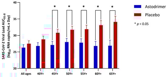 Results for the primary analysis are presented in Table 3 and Figure 4. The SARS-CoV-2 RNA burden (vAUCd1–8 for SARS-CoV-2 viral load) was lower in the astodrimer group than in the placebo group across the complete mITT (−1.2 log10 copies/mL × Day), although the difference did not reach statistical significance. However, the magnitude of the reduction in viral burden with astodrimer versus placebo increased with participant age and was statistically significant in the mITT age subgroups: 45 Y+ (−3.7 log10 copies/mL × Day, p = 0.017), 50 Y+ (−3.8 log10 copies/mL × Day, p = 0.018), 55 Y+ (−4.2 log10 copies/mL × Day, p = 0.024), 60 Y+ (−6.2 log10 copies/mL × Day, p = 0.003), and 65 Y+ (−7.3 log10 copies/mL × Day, p = 0.005).