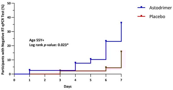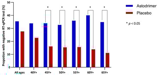 In the complete mITT population, a higher proportion of participants in the astodrimer group (35.4%, 34/96) attained a negative RT-qPCR test result at or by Day 8 compared to those assigned to the placebo group (27.7%, 28/101), although this difference did not reach statistical significance. However, beginning with the age subgroup 45 Y+, a significantly higher proportion of participants using astodrimer achieved a negative RT-qPCR compared to placebo (Figure 5). In these age subgroups, the negative RT-qPCR was attained in fewer days by those randomised to astodrimer, with statistically significant differences particularly pronounced in those aged 55 Y+ (Figure 6 and Figures S1–S7). Corresponding hazard ratios (HRs) were greater than two in the 45 Y+, 50 Y+, and 55 Y+ subgroups, and greater than three in the 60 Y+ and 65 Y+ subgroups (Table 4).
