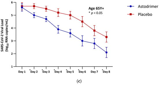 SARS-CoV-2 RNA load at each determination by treatment and age group: (a) all ages (mITT), (b) 45 Y+ and (c) 65 Y+. Compared using least squares means difference. * p < 0.05.