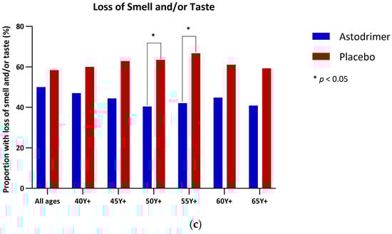 The proportion of participants with loss of sense of smell (anosmia) on any given day after starting the study treatment was consistently lower in the astodrimer sodium group (Table S10). This difference became more pronounced with advancing age, showing statistical significance in those aged 55 Y+ and 65 Y+ (Figure 8a). Similarly, the proportion of participants reporting loss of sense of taste (ageusia) was also consistently lower in those assigned to astodrimer, particularly among older population subsets (Figure 8b). The analysis of the proportion of participants reporting loss of sense of smell and/or loss of sense of taste followed the same pattern, with statistically significant results observed in the age subsets 50 Y+ and 55 Y+ (Figure 8c).