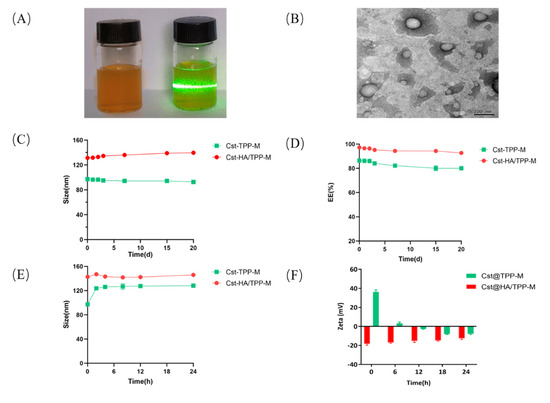 (A) Appearance and Tyndall effect of Cst@HA/TPP-M. (B) TEM image of Cst@HA/TPP-M. (C,D) Changes in the particle size and encapsulation efficiency of Cst@TPP-M and Cst@HA/TPP-M stored at 4 °C for 20 days. (E,F) Changes in the particle size and Zeta potential of Cst@TPP-M and Cst@HA/TPP-M after incubation with 10% FBS.