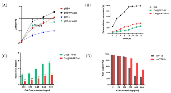 (A) Change in Zeta potential of Cst@HA/TPP-M after incubation with and without HAase (1 mg/mL) at different pHs (pH 7.4 and 5.0) over time. (B) In vitro cumulative release rate of Cst. (C) Hemolysis rate of Cst@TPP-M and Cst@HA/TPP-M at different Cst concentrations, ** p < 0.01, vs. Cst@TPP-M. (D) Cell viability of LO2 cells after treatment with TPP-M and HA/TPP-M for 24 h.