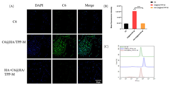 Liposoluble probe C6 with green fluorescence is a commonly used alternative to liposoluble drugs without fluorescence for the qualitative and quantitative observation of cellular uptake [29]. Because the particle size and Zeta potential of C6@HA/TPP-M were close to those of Cst@HA/TPP-M (Table 1), it was feasible to replace Cst with C6. It was observed that a large amount of C6 green fluorescence appeared around the blue cell nuclei after incubation with C6@HA/TPP-M for 4 h, whereas a small amount of green fluorescence appeared in the free-Cst-treated cells (Figure 3A). Flow cytometry analysis verified that the fluorescence intensity of C6@HA/TPP-M was three times higher than that in the free C6 group (Figure 3B,C), implying that HA/TPP-M has the potential to deliver drugs into cells and efficiently elevate the drug uptake amount in cells. To further prove that the increasing C6 uptake amount in the C6@HA/TPP-M group may have been related to the CD44 receptors highly expressed on the cytomembrane, MDA-MB-231 cells were pretreated with excessive HA for 1 h before treatment with C6@HA/TPP-M. The result showed that the fluorescence intensity declined sharply, which was significantly different from C6@HA/TPP-M without HA pretreatment (p < 0.001). The preferential binding of excessive HA and CD44 receptors [30] might have caused a decrease in receptors that could bind C6@HA/TPP-M. According to this result, it can be inferred that the cell uptake mechanism of Cst@HA/TPP-M might depend on the CD44-receptor-mediated endocytosis pathway.
