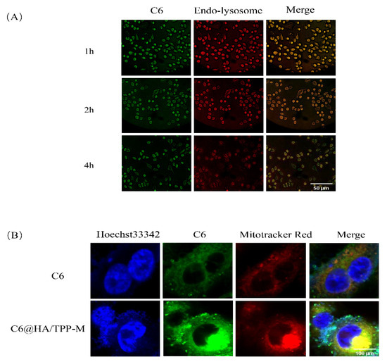 Jayanth et al. reported that biodegradable nanoparticles consisting of poly (DL-lactide-co-glycolide) can selectively reverse the surface charge of nanoparticles from negative to positive in the acidic environment of endo-lysosomes, thus quickly escaping endo-lysosomes into the cytosol [31]. Our previous experiment proved that the acidic environment was an important factor for the degradation of HA, and the potential of Cst@HA/TPP-M would be changed from negative to positive after HA degradation. Therefore, C6@HA/TPP-M might easily escape endo-lysosomes due to the charge imbalance in endo-lysosomes caused by HA degradation [32]. As illustrated in Figure 4A, after incubation with C6@HA/TPP-M for 1 h, the green fluorescence presented by C6 mainly coincided with the red fluorescence presented by the endo-lysosomes in the cells, producing a remarkable yellow fluorescence, which indicated that C6@HA/TPP-M might have already entered the endo-lysosomes. However, after 2 h, this yellow fluorescence gradually weakened, and after 4 h, a faint green fluorescence appeared, meaning that C6@HA/TPP-M might escape from endo-lysosomes and enter the cytoplasm. The cell nuclei in Figure 4B were stained blue by Hoechst33342, and the mitochondria were stained red. Compared to the weaker green fluorescence of the free C6 group, C6@HA/TPP-M exhibited a stronger green fluorescence around the labeled blue nuclei, indicating an increase in C6 intake, which was consistent with the previous experimental result of cell uptake. Notably, the yellow fluorescence representing the overlapping of C6 and mitochondria obviously appeared around the blue nuclei of the C6@HA/TPP-M group, suggesting that the mixed micelles constructed by TPP-Chol facilitated the mitochondria-targeted delivery of C6.