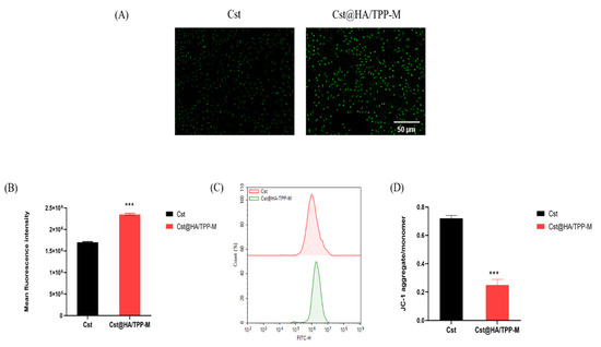 Porporato et al. [33] reviewed that excessive levels of ROS not only promote the migration and invasion of TNBC cells, but also result in ROS-induced apoptosis and damage. For survival, mitochondria cleverly maintain the level of ROS. Therefore, emerging excessive ROS generation to destroy the balance maintained by the mitochondria may be a good way to induce TNBC cell death. After the same incubation time, the ROS levels of free Cst and Cst@HA/TPP-M were detected using an ROS detection kit. As presented in Figure 5A–C, the fluorescence intensity of Cst@HA/TPP-M was evidently higher than that of the free Cst group (p < 0.001), suggesting that Cst@HA/TPP-M effectively increased the ROS level, which might have resulted from the increased drug uptake and successful mitochondria-targeted delivery proven by the previous experiments.