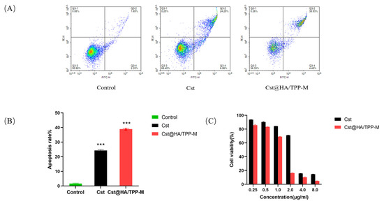 The apoptosis induced by free Cst and Cst@HA/TPP-M in the MDA-MB-231 cells was evaluated via the Annexin V-FITC/PI staining method. Briefly, after adhesion and growth in 6-well plates, the cells were incubated separately with free Cst and Cst@HA/TPP-M (the Cst concentration was 1 μg/mL) for 24 h, and then the cells were washed, collected, and resuspended in a binding buffer. Prior to flow cytometry analysis, the cells were sequentially stained with Annexin V-FITC and PI according to the operation instructions of the Annexin V-FITC/PI kit.