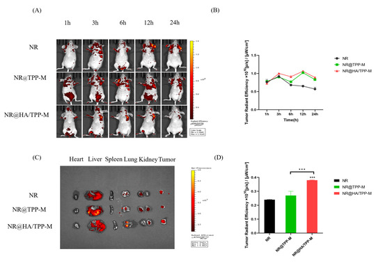 (A) In vivo real-time imaging of MDA-MB-231-tumor-bearing nude mice after intravenous injection with free NR, NR@TPP-M, and NR@HA/TPP-M. (B) The total radiant efficiency in the tumors of MDA-MB-231-tumor-bearing nude mice after intravenous injection with free NR, NR@TPP-M, and NR@HA/TPP-M. (C) Ex vivo optical images of the major organs (heart, liver, spleen, lung, kidney, and tumor) collected at 24 h post-injection. (D) The total radiant efficiency in the tumors which were taken after the mice were sacrificed at 24 h after injection. *** p < 0.001, vs. NR. All data are represented as mean ± SD.