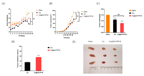 (A) Change in the body weight of MDA-MB-231-tumor-bearing nude mice after intravenous injection with saline, Cst, and Cst@HA/TPP-M, * p < 0.05, ** p < 0.01. (B) Change in the tumor volume of MDA-MB-231-tumor-bearing nude mice after intravenous injection with saline, Cst, and Cst@HA/TPP-M, ** p < 0.01. (C) Tumor index analysis of tumor weight relative to body weight, ** p < 0.01, *** p < 0.001. All data are represented as mean ± SD. (D) Tumor inhibition rate analysis, *** p < 0.001, vs. Cst. (E) Macroscopic appearance of tumors collected from MDA-MB-231-tumor-bearing nude mice after treatment.
