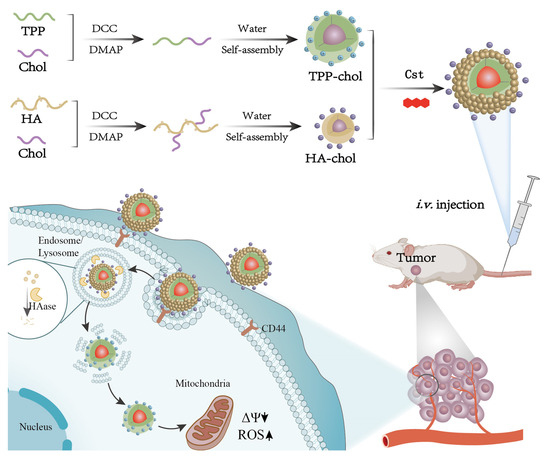 Cst was provided by Push Biotechnology Co., Ltd. Chengdu, China; Cholesterol, a DCFH-DA fluorescent probe, JC-1 fluorescent probe, and Nile red (NR) were purchased from Solarbio Science & Technology Co., Ltd., Beijing, China; Sodium hyaluronic acid (HA-Na, MW 12 kDa), N, N′-dicyclohexylcarbodiimide (DCC), 4-dimethyl aminopyridine (DMAP), N, N-dimethylformamide (DMF), coumarin 6 (C6), and hyaluronidase (HAase) were obtained from Aladdin Biochemical Technology Co., Ltd., Shanghai, China; Mitotraker red, an ROS detection kit, and an Annexin V-FITC/PI detection kit were supplied by Biyuntian Biotechnology Co., Ltd., Shanghai, China; The MDA-MB-231 cells were bought from the Shanghai Institute of Biochemistry and Cell Biology. High-glucose DMEM, fetal bovine serum (FBS), and trypsin/EDTA solution were supplied by Thermo Fisher Gibico, Waltham, MA, USA. All other chemicals were of analytical or chromatographic grade. BALB/c-nude mice obtained from Changshen Biotechnology Co., Ltd., Liaoning, China, were housed in SPF-grade animal rooms with a 12 h light/dark cycle and fed with standard food and water. All animal experiments were authorized by the Laboratory Animal Ethics Committee of Hubei University of Chinese Medicine.