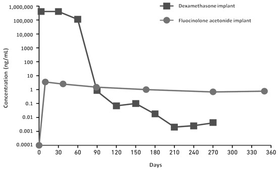 32. Campochiaro, P.A.; Nguyen, Q.D.; Hafiz, G.; Bloom, S.; Brown, D.M.; Busquets, M.; Ciulla, T.; Feiner, L.; Sabates, N.; Billman, K.; et al. Aqueous Levels of Fluocinolone Acetonide after Administration of Fluocinolone Acetonide Inserts or Fluocinolone Acetonide Implants. Ophthalmology 2013, 120, 583–587. [Google Scholar] [CrossRef] [PubMed]