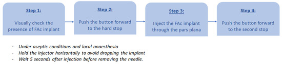 The intravitreal injection procedure should be carried out under aseptic conditions, under local anesthesia (Figure 3). After opening the box, the ophthalmologist must first visually check through the viewing window of the preloaded applicator to ensure that there is a drug implant inside. To prep the applicator, the button should be slid forward in one continuous motion until it comes to a hard stop at the end of the track. Prior to injection, the applicator tip must be kept above the horizontal plane to avoid dropping the implant. As no tunnelling or stitching is required after the injection, the conjunctiva needs to be displaced so that the conjunctival and scleral entry sites do not align. The FAc implant is then injected into the vitreous cavity through the pars plana (at 4 mm from the limbus) while performing a slight rotation of the special injector with a 25-gauge needle. To release the implant, the injector button is slightly pushed down and slid forward at the end of the track until it reaches the second stop. A pause of 5 s should be carried out before removing the needle from the eye to allow for the implant to be slowly deposited inside the eye. While the injection is recommended by the manufacturer to be in inferior, superior injections are also possible, with no added complications.