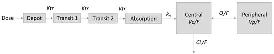 For model building purposes, the population PK model developed by Brussee et al., using PK data obtained from 200 children 2–12 years of age and 11 adults, was used as the baseline structural model [7]. Brussee et al.’s model is a two-compartment PK model including two transit compartments to account for a delay in absorption, which was initially assumed for both formulations [19]. To align with the previously reported model from Brussee et al., body weight was included as a covariate for clearance CL, intercompartmental clearance Q, and volume of distribution in the central Vc and peripheral Vp compartment, and allometric scaling centered to 18 kg was applied, with the coefficients fixed to 0.75 for clearance and 1 for volume (Figure 1). Ivermectin typical oral clearance (CL) was described as a nonlinear function of weight (CL = 5.8 × (weight/18)0.75). The model included two transit compartments with ktr = ka, leading to a computed mean transit time MTT = 3/ktr. The choice of two transit compartments as the baseline model structure has been made because of a previously published model-based analysis in pediatric patients. However, another study in healthy volunteers has found an increased number of transit compartments to describe ivermectin absorption data best (N = 6) [9,10]. A sensitivity analysis for the number of transit compartments for each formulation, with up to 6 transit compartments tested, was conducted. Population parameters were estimated, using estimates from Brussee et al. as initial values. Again, as per Brussee et al., inter-individual variability (IIV) was included for the absorption rate constant, clearance, and both volume parameters (central and peripheral compartment), with individual parameters assumed to be log-normally distributed. Initially, a mixed residual error model was assumed. The covariance matrix of random effects was initially set to a diagonal matrix (no correlation between random effects assumed).