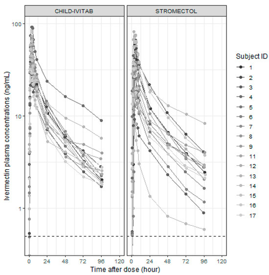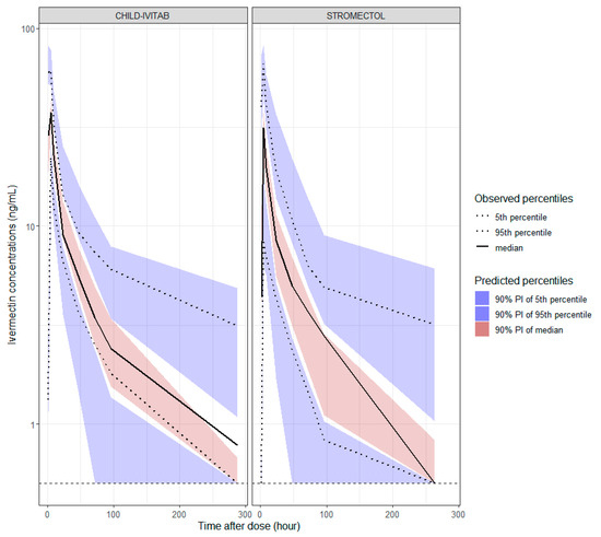 A total of 448 ivermectin venous plasma concentrations were available and included in the population PK analysis, of which 40 (8.9%) concentrations were below the limit of quantification (BLQ), all during the absorption phase, and 16 were pre-dose samples. The remaining plasma concentrations of ivermectin following CHILD-IVITAB and STROMECTOL® dosing were in the range of 0.53–92.45 ng/mL and 0.51–82.79 ng/mL, respectfully (Figure 2).