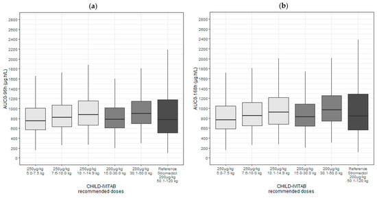 Simulated ivermectin exposure (N = 1000) according to weight-based ivermectin dosing regimen in adults following a single administration of 200 µg/kg of the reference STROMECTOL® formulation and according to defined dose recommendations of 250 µg/kg in children < 15 kg and 200 µg/kg in children ≥ 15 kg following a single CHILD-IVITAB administration. (a) Simulated ivermectin exposure 96h after dosing (area under the concentration–time curve, AUC0–96h). (b) Simulated ivermectin exposure 168h after dosing (AUC0–168h). IQR, inter-quartile range.