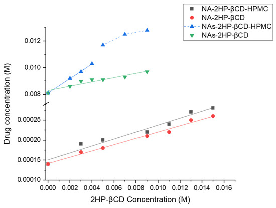 Phase solubility diagrams of the binary (NA/NAs-2HP-β-CD) and ternary (NA/NAs-2HP-β-CD-HPMC) systems. The lines represent the best-fit linear regression of the data points (n = 3, coefficient of variation < 3%, error bars not shown for clarity).