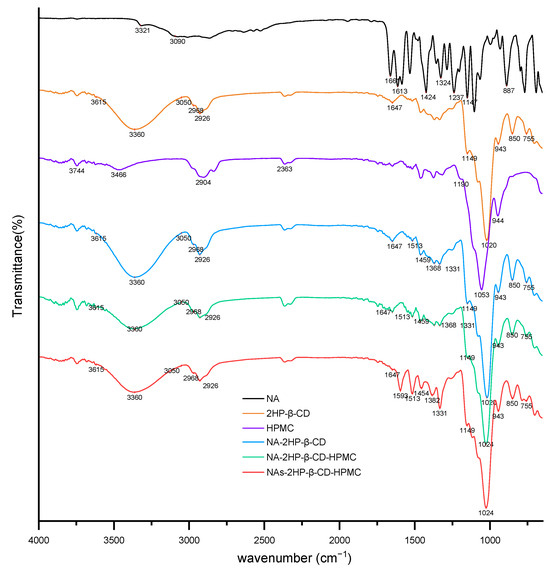 FT-IR spectra of NA, 2HP-β-CD, HPMC, binary (NA-2HP-β-CD), and ternary (NA/NAs-2HP-β-CD-HPMC) systems.