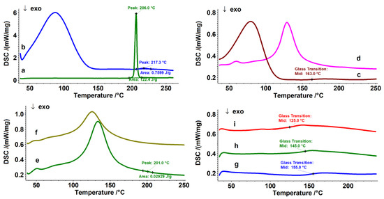 DSC curves of the studied structures: NA (a); NA-2HP-β-CD (b); HPMC (c) (first heating); 2HP-β-CD (d); NA-2HP-β-CD-HPMC (e); NAs-2HP-β-CD-HPMC (f); HPMC (g) (second heating); NA-2HP-β-CD-HPMC (h) (second heating); and NAs-2HP-β-CD-HPMC (i) (second heating).
