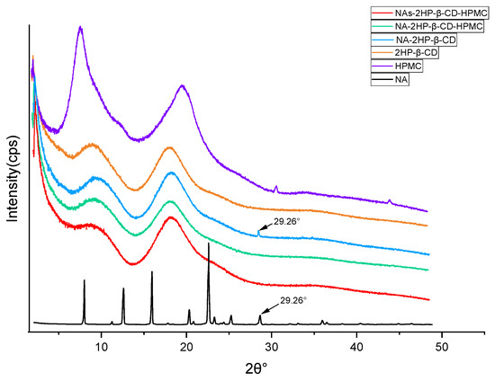 XRD patterns of NA, 2HP-β-CD, HPMC, NA-2HP-β-CD, NA-2HP-β-CD-HPMC, and NAs-2HP-β-CD-HPMC.