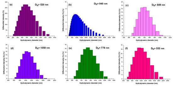 Figure 6 shows the results of the DLS analysis used to determine the size of the obtained complexes to illustrate their functionalization. According to the DLS histograms, dimensionally homogeneous assemblies appeared, with a notable increase in hydrodynamic diameter with different functionalizations.