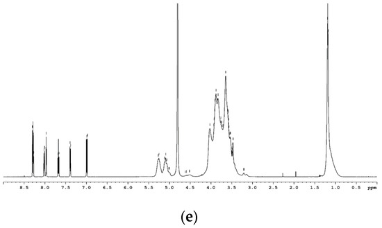 Compared to previously described techniques, which cannot definitively distinguish between inclusion complex formation and adsorption phenomena or determine the structural conformation of molecules, NMR spectroscopy is a powerful tool for identifying the formation of an inclusion complex [78]. It provides direct evidence for the inclusion of a guest molecule in the CD cavity. If the guest molecule is included in the CD cavity, the H-3 and H-5 protons inside the cavity will be affected by the changed environment, resulting in characteristic chemical shift changes observable in the ¹H-NMR spectrum [79]. Figure 7 shows the ¹H-NMR spectra of NA, 2HP-β-CD, and the inclusion complexes. The proton signal assignments for NA (Figure 7a) and 2HP-β-CD (Figure 7b) were determined based on the relevant literature [35,80,81]. Thus, for 2HP-β-CD, most protons from glucose and propyl residues resonate in the interval of 3.48–4.01 ppm, with methyl groups resonating at 1.14–1.15 ppm and glucose H1 protons resonating at 5.08 and 5.26 ppm. NA has several sets of signals associated with the pyridine ring at 6.97 (H3), 8.01 (H2), and 8.37 (H4) ppm and with the phenyl ring at 7.56 (H8), 7.61 (H9), 7.66 (H10), and 7.89 (H12) ppm. The spectra of the inclusion complexes showed the proton signals of both NA and 2HP-β-CD, and their chemical shift values are presented in Table 3. Because, in the case of substituted CDs like 2HP-β-CD, the proton signals are severely overlapped and individual assignments are difficult to make, we followed the chemical shift variations of the guest protons (Table 3).