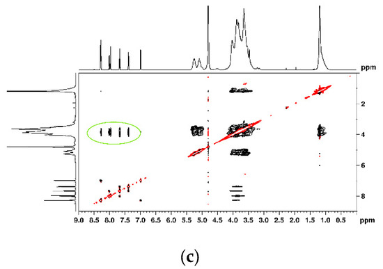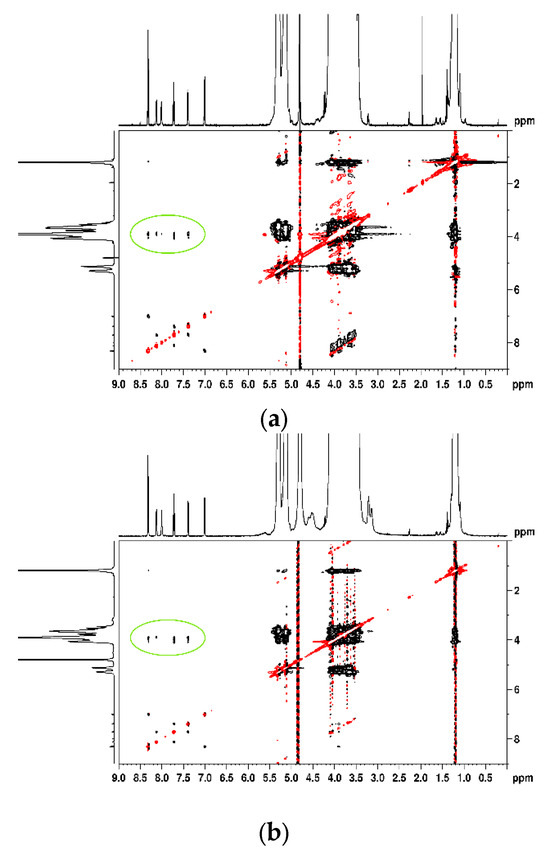 Considering the dynamic nature between host and guest, these variations indicate the following two possible inclusion modes: one with the incorporation of trifluoromethylphenyl residue in the 2HP-β-CD cavity and the second one with a pyridine ring inside. These two inclusion modes are supported by the NOE cross-peaks visible in the 2D ROESY spectra (Figure 8). The figure emphasizes through-space interactions (circled in green) between protons from NA and 2HP-β-CD, situated less than 5 Å, which confirms the insertion of the guest molecule into the 2HP-β-CD cavity, providing additional conformational information about the synthesized binary and ternary inclusion complexes [54].