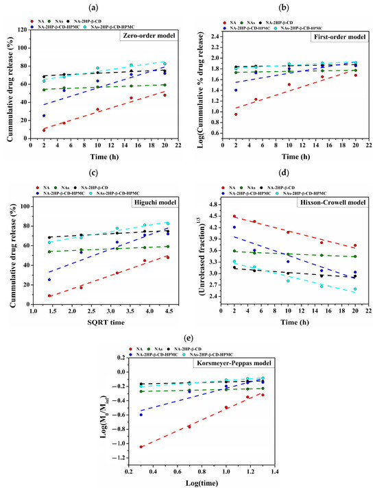In addition, several mathematical models were applied in order to analyze the experimental data. These models, including the zero-order, first-order, Higuchi, Hixson–Crowell, and Korsmeyer–Peppas models, are reported in the literature for their effectiveness and applicability for kinetic profile studies [48].