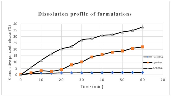 The mitotane-loaded P-SEDDS formulation exhibited faster drug release characteristics (>20%) within 20 min. On the contrary, the Lysodren® formulation showed a maximum 10% release only in a 30 min time period. A nearly 5-fold (in 20 min) improvement in the dissolution rate was, therefore, revealed by the mitotane-loaded P-SEDDS formulations vis-à-vis the Lysodren® formulation. The observations revealed from the present studies are in consonance with the previously published literature reports about a self-emulsifying drug delivery system strategy and about the pure drug [27,28].