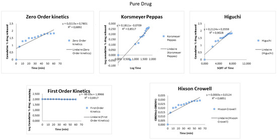 The obtained release profiles were analyzed with zero-, first-, and second-order kinetics, as well as the Korsmeyer–Peppas [22,23], Higuchi [24], and Hixon–Crowell models [25].