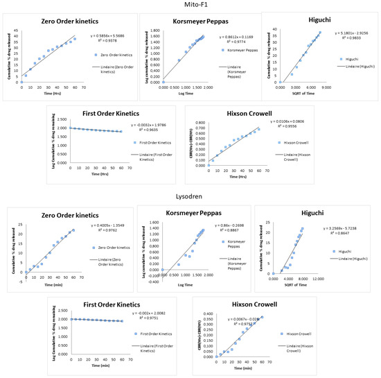 Drug release data fitted to various kinetic models (zero-order, first-order, Korsmeyer–Peppas, Hixson–Crowell, and Higuchi) obtained from the dissolution studies of pure drug, Lysodren®, and MitoF1.