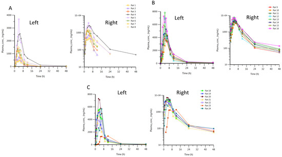 Individual plasma concentration of mitotane after oral administration of (A) Lysodren®, (B) MitoF1 and (C) MitoF2 at 100 mg/kg in rat in linear scale (left panel) and semi-log scale (right panel).