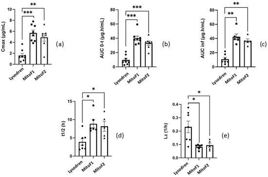 MitoF1 and MitoF2 showed a significant difference; p-value < 0.001 and 0.01, respectively, in Cmax; p-value < 0.001 about AUC0–t; p-value < 0.01 for AUCinf; p-value < 0.5 in t1/2 and Lz (see Figure 5). We could see an increase in Cmax, AUC0–t, AUCinf, and t1/2 and a diminution in Lz in comparison with Lysodren®. On the other hand, there was no difference between MitoF1 and MitoF2 on the same data (p-value > 0.5) (Table 4, Figure 5).