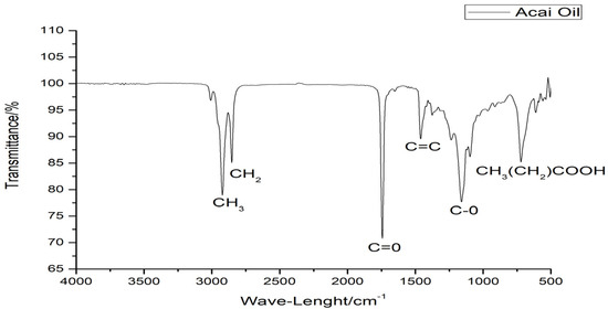 The physicochemical analyses carried out showed characteristic values of acai oil similar to those described in the literature and within the standards accepted by Brazilian and international legislation. The FA profile of the oil showed a predominance of MUFA and PUFA, such as oleic, linoleic, and palmitoleic acids, consistent with the values found by the lipid quality indices. The spectroscopic profile was corroborated by the well-defined bands corresponding to the functional groups present in the FA obtained by ATR-FTIR. Thermal analysis showed a profile typical of vegetable oils, with thermal degradation occurring above 200 °C.