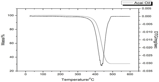 The TG curve highlighted a mass loss in the temperature range between 384.71 and 451.57 °C, corresponding to the decomposition of the oil (Figure 2). The event is confirmed by the peak at about 440 °C in the DTG profile.