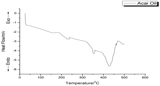 For thermogravimetric analysis (TG), derived thermogravimetry (DTG), and differential scanning calorimetry (DSC) tests, about 5 mg of acai oil was accurately weighed in a platinum crucible and aluminum crucible, respectively, and the analyses were performed under the following conditions: nitrogen atmosphere (50 mL/min) and heating rate of 10 °C/min in a temperature range from 25 to 550 °C. For TG/DTG and DSC analyses, a TGA-50 thermal analyzer (Shimadzu®, Kyoto, Japan) and a DSC-60 plus equipment (Shimadzu®, Kyoto, Japan), respectively, were used. The mass loss and enthalpy variation calculations were performed using the TA 60w Shimadzu® program [16].