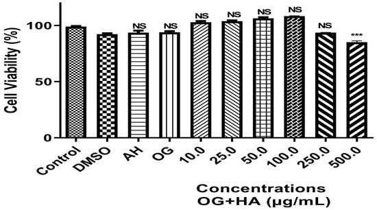 The OG and OG + HA were dispersed in 20 µL of dimethyl sulfoxide (DMSO 0.5%). The solution was vortexed for 1 min, then aliquoted in different concentrations (10, 25, 50, 100, 250, and 500 µg/mL) in the laminar flow chamber for use in cell viability assays. The test was carried out using the MTT ([3-(4,5-dimethylthiazol-2-yl)-2,5-diphenyltetrazolium bromide]) assay. To carry out this assay, a method reported in the literature, with minor modifications, was used as follows [23,24,25]: 2.43 × 106 cells/well were incubated with different concentrations of OG + HA in sterile 96-well plates for 48 h. The culture medium was then discarded, and 20 µL of 0.05% MTT (Sigma-Aldrich®) was added to each well. Then, the plate was incubated for 3 h under 5% of carbon dioxide in an air-humidified incubator at 37 °C.