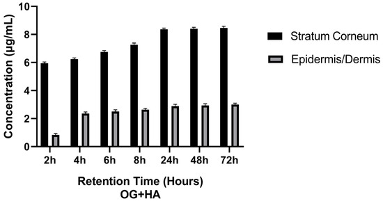 It was observed that, as the contact time of the OG + HA formulation with the pig membrane increased, there was a proportional increase in the concentration of the active ingredient in the stratum corneum and epidermis/dermis, with more than 80% of the HA released after 6 h of application of the formulation, as shown in Table 5 and Figure 5. For an anti-aging formulation, the results are favorable because in topical dermatological formulations, the active ingredient is not intended to reach the blood circulation, although it is important that it penetrates beyond the skin surface, i.e., into the stratum corneum, epidermis, and dermis. The permeation of the active ingredient contained in a cosmetic product must overcome some obstacles, such as the stratum corneum. However, when it comes to topical cosmetic products, it is desired that the active compound does not permeate the systemic circulation, but remains in the skin, and skin retention tests have demonstrated the ability of the active ingredient to remain in the skin layers for up to 72 h [54,55,56].