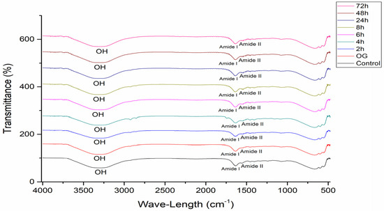 The causes of skin dryness are not yet perfectly understood; however, ATR-FTIR has been shown to be able to detect changes in the water content of the stratum corneum promoted by the use of OG + HA, according to the results presented previously. This method is widely used to measure skin hydration after the application of different cosmetic formulations [30,57,58]. Figure 6 shows the spectra obtained in the study, highlighting the free hydroxyl groups in the compound (OH), amide I, and amide II peaks [42,43]. Gloor [31] obtained the water content from the ratio between the amide I and amide II bands; amide I (1580–1720 cm−1) is related to the disordered stretching vibrational mode of the C=O molecule coupled with the vibrational modes of angular deformation of the NH molecule and the stretching of the CN molecule of the secondary structures of the protein; and amide II (1475–1580 cm−1) corresponds to the vibrational modes of angular deformation of the NH molecule and the stretching of the CN molecule. The higher this ratio, the greater the hydration, since the amide I band overlaps the water band [59].