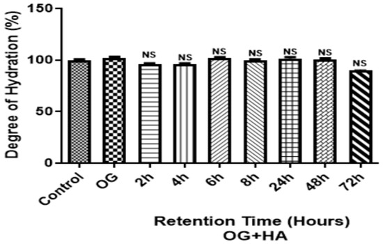 The results showed no significant differences (p < 0.0001) (Figure 7) in the degree of hydration between the evaluated times of OG + HA in the pig skin fragments when compared to the control (fragment without organogel), demonstrating that the skin hydration varied in the range of 90.51–102.58%. However, it was observed that the highest percentage of water concentration was obtained after 6h of application of OG + HA, which correlates with the result of the retention study, which showed that more than 80% of the active ingredient was released after 6 h of application. Furthermore, it can be seen that the organogel retained a high percentage of water, over 90%, after 72 h of application of OG + HA, thus maintaining membrane hydration after a long period of time.