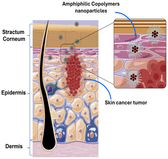 Amphiphilic copolymers (ACs) are versatile systems with self-assembling and aggregating properties, enabling the formation of nanomaterials (NMs) such as micelles, vesicles, nanocapsules, and nanogels. These materials have been extensively explored for the delivery of various drugs and active compounds, enhancing the solubility and permeation of poorly water-soluble drugs into skin tissue. This improvement facilitates the treatment of skin diseases, including chronic conditions like cancer, as well as infections caused by bacteria, fungi, and viruses. This review summarizes recent applications of ACs in skin treatment, with a particular focus on their use in anti-cancer drug therapy. It covers the synthesis, classification, and characterization of ACs using various experimental techniques. Additionally, it discusses recent research on different drug delivery pathways using ACs, including encapsulation efficiency, release behavior, characteristics, applications, and responses to various chemical and physical stimuli (both in vivo and in vitro). Furthermore, this review provides a comprehensive analysis of the effects of ACs NMs on several skin diseases, highlighting their potential as alternative treatments.