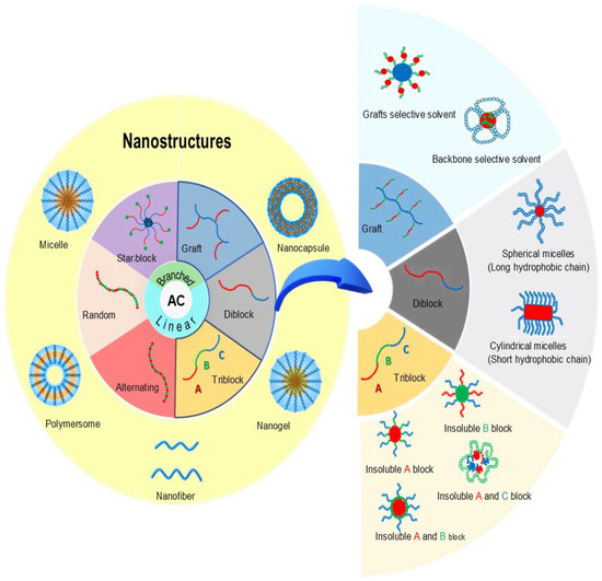 Branched and linear AC classification based on topology and composition (colorful pie chart). Nanostructures formed by different ACs are shown in yellow circumference. Basic micellar morphologies depending on selective solvents, for triblock or graft copolymers, and length of the hydrophilic segment (for deblock copolymers) are shown in the half colorful pie chart. Adapted from [17,20].