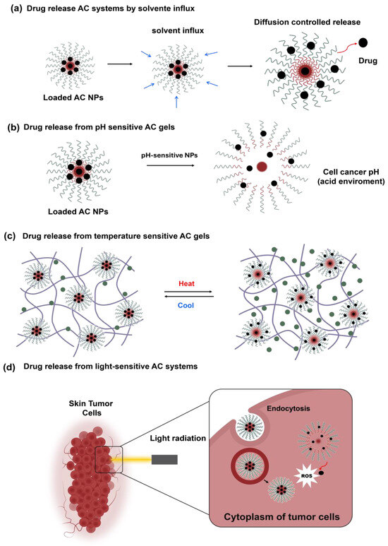 Illustration of different drug release mechanisms on AC NMs: (a) Controlled drug release by solvent influx. (b) Drug release triggered by pH changes. (c) Drug release in response to temperature variation. (d) Drug release from ACs systems combined with phototherapy to produce reactive oxygen species (ROS) in tumor cells.
