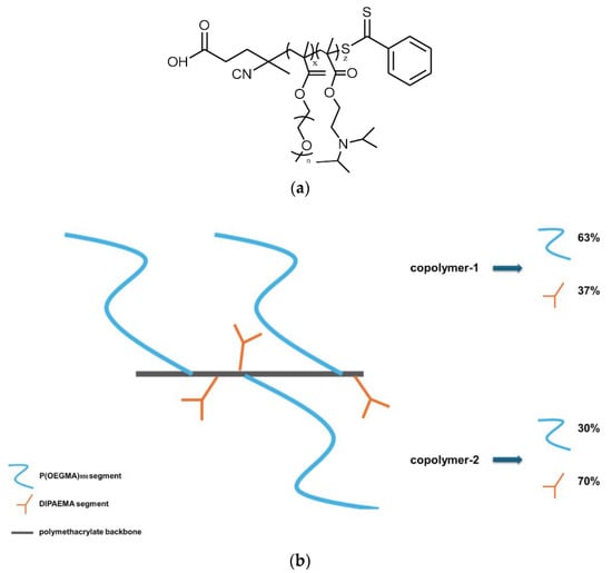 (a) The chemical structure of the random copolymer P(OEGMA950-co-DIPAEMA) synthesized by RAFT polymerization; (b) Graphic illustration of P(OEGMA-co-DIPAEMA)-1 or copolymer 1 and P(OEGMA-co-DIPAEMA)-2 or copolymer 2, respectively, with a different % comonomer ratio.