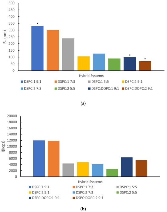Charts derived from DLS measurements at 25 °C: (a) The hydrodynamic radius (Rh, nm); (b) the scattered intensity (I, kilocounts per second or kcps) of hybrid colloidal dispersions the day of their preparation, utilizing water for injection as the dispersion medium. The standard deviation (SD) is less than 10% in both diagrams. * Hybrid systems with more than one population; the predominant (higher intensity) one is presented in the graph.
