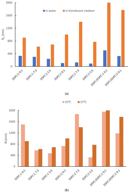 The hydrodynamic radius (Rh, nm) of the hybrid colloidal dispersions in: (a) different dispersion media at body temperature (37 °C); (b) FBS:PBS biorelevant medium at different temperatures. The standard deviation (SD) is less than 10% in both diagrams. The DSPC:DOPC:1 9:1 hybrid system at 37 °C in both diagrams refers to a very high Rh compared with the rest of the systems exceeding the scale of the graph.