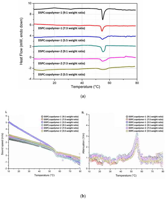 Thermodynamic evaluation of DSPC:P(OEGMA-co-DIPAEMA)-1 and -2 in an acidic environment (pH 4.5): (a) mDSC profiles; (b) (i) sound speed or (ii) attenuation vs. temperature from HR-US.