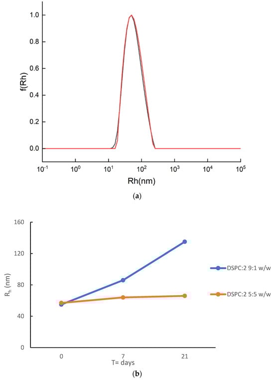 (a) Size distributions from the DLS of DSPC:P(OEGMA-co-DIPAEMA)-2 hybrid systems incorporating MTX at two different lipid to polymer ratios, 9:1 (black line) and 5:5 (red line), on the day of their preparation; (b) the systems’ stability assessment (Rh vs. time) under storage conditions (4 °C) for 21 days.