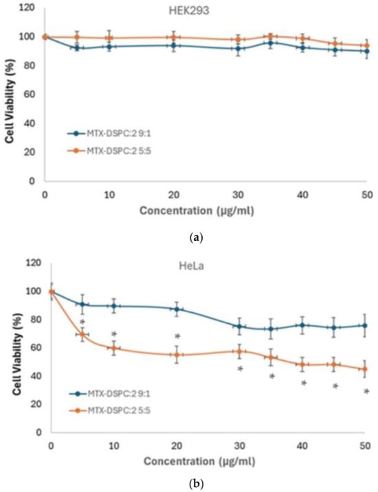 Cell viability vs. different concentrations of MTX-DSPC:2 9:1 (blue line) and MTX-DSPC:2 5:5 (orange line) on (a) HEK293 and (b) HeLa cells. The concentration levels refer to MTX concentration, and the obtained data represent the means ± standard deviation from three experiments conducted in triplicates. The asterisks (*) in (b) correspond to p values of less than 0.05 (p < 0.05) that are considered as statistically significant.