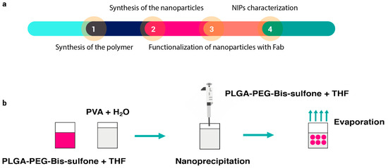 Panel (a) illustrates the sequence of steps involved in synthesizing and characterizing NIPs. The process begins with the synthesis of the polymer (Step 1), followed by the synthesis of nanoparticles via nanoprecipitation (Step 2). Once formed, the nanoparticles are functionalized with the antibody (Step 3), and finally, the particles undergo characterization (Step 4). Panel (b) depicts a schematic of the nanoprecipitation technique. In this technique, PLGA-PEG-Bis-sulfone polymer is dissolved in THF (tetrahydrofuran). This solution is then added dropwise to continuously stirred water. The mixture is left stirring until nanoparticles are formed.